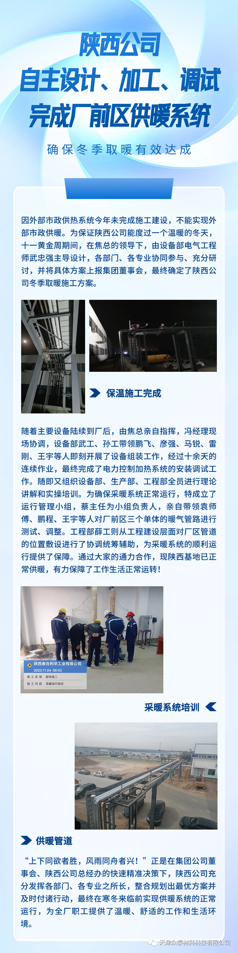 為保證陜西公司能度過一個溫暖冬天,十一黃金周期間,在陜西公司焦總的帶領下,由設備部電氣工程師武忠強主導設計,各部門、各專業(yè)協(xié)同參與、充分研討,最終確定了陜西公司冬季取暖施工方案。通過大家通力合作,現(xiàn)陜西基地已正常供暖,有力保障了工作生活正常運轉!