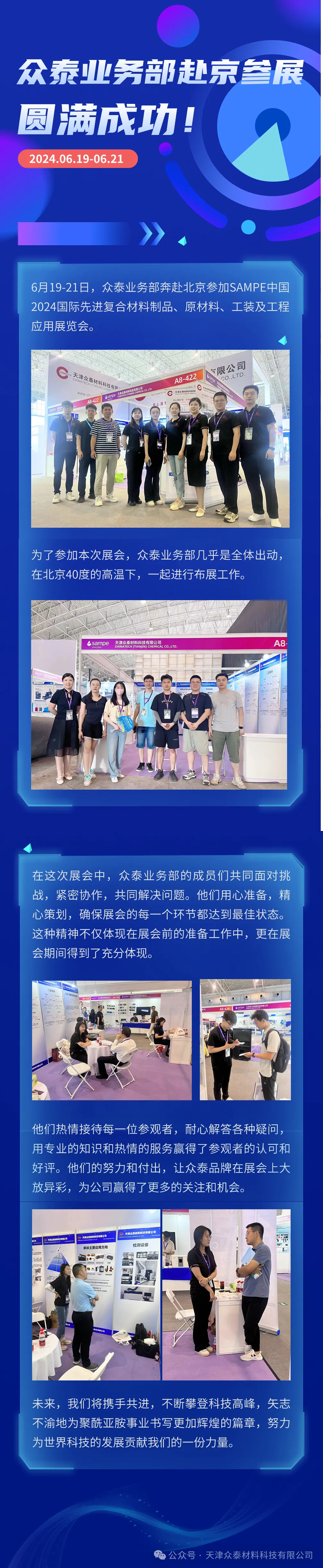 6月19日-21日,眾泰業(yè)務(wù)部奔赴北京參加SAMPE中國2024國際先進復(fù)合材料制品、原材料、工裝及工程應(yīng)用展覽會。在這次展會中,眾泰業(yè)務(wù)部的成員們共同面對挑戰(zhàn),緊密協(xié)作,共同解決問題。